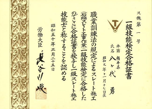 創業から10年が経った1975年。先代の積み重ねてきた努力が、ひとつの大きな形となりました。 スレート施工(岩綿スレート工事作業)において、「1級技能士」に合格。 驚くべきことに、この資格の合格第一号だったのです。
