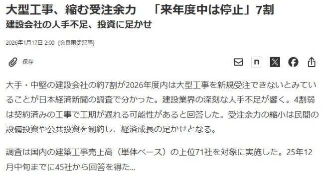 『週間帝国ニュース』北陸版でも「工事遅延や計画見直しにより仕事の少ない状態が続く(鉄骨工事)」と報じられ、『日本経済新聞』の調査では、建設会社の約7割が2026年度内の新規大型受注が困難であると回答しています。