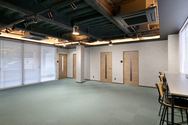 さらに、北向きの景色が良い窓側には外側にむけて机を配置することで、リフレッシュや集中作業に最適な空間をご提供し、用途に合わせた十分な会議室スペースの確保と、会議室ごとに壁紙を変えることで機能性とデザイン性を高めております。