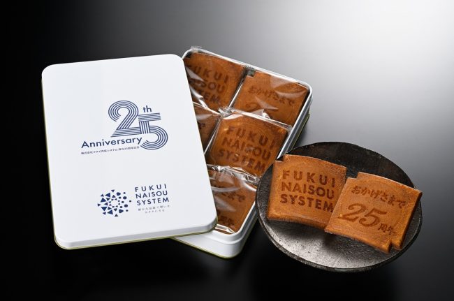 瓦せんべいには「堅固で繁栄する」という縁起の良い意味も込められています。 表面には、弊社のロゴマークと「おかげさまで25周年」という感謝の焼き印を施していただきました。