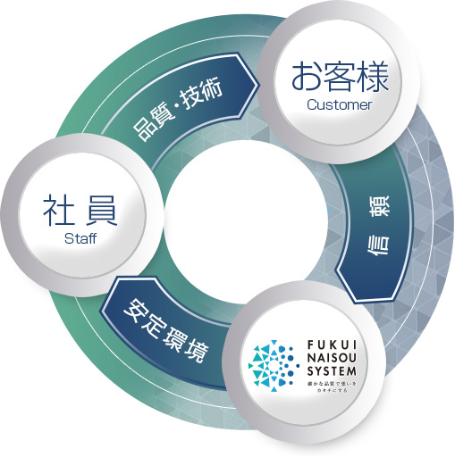 これは内装工事を取り巻く環境の変化「人手不足」「高齢化」「施工範囲の拡大」「施工内容の複雑化」に対し、私たち内装工事専門会社が変化に適応しながら課題を解決し、お客様や市場の信頼へつなげていくには、安心して働ける環境づくりが一番大切だと考えているからです。